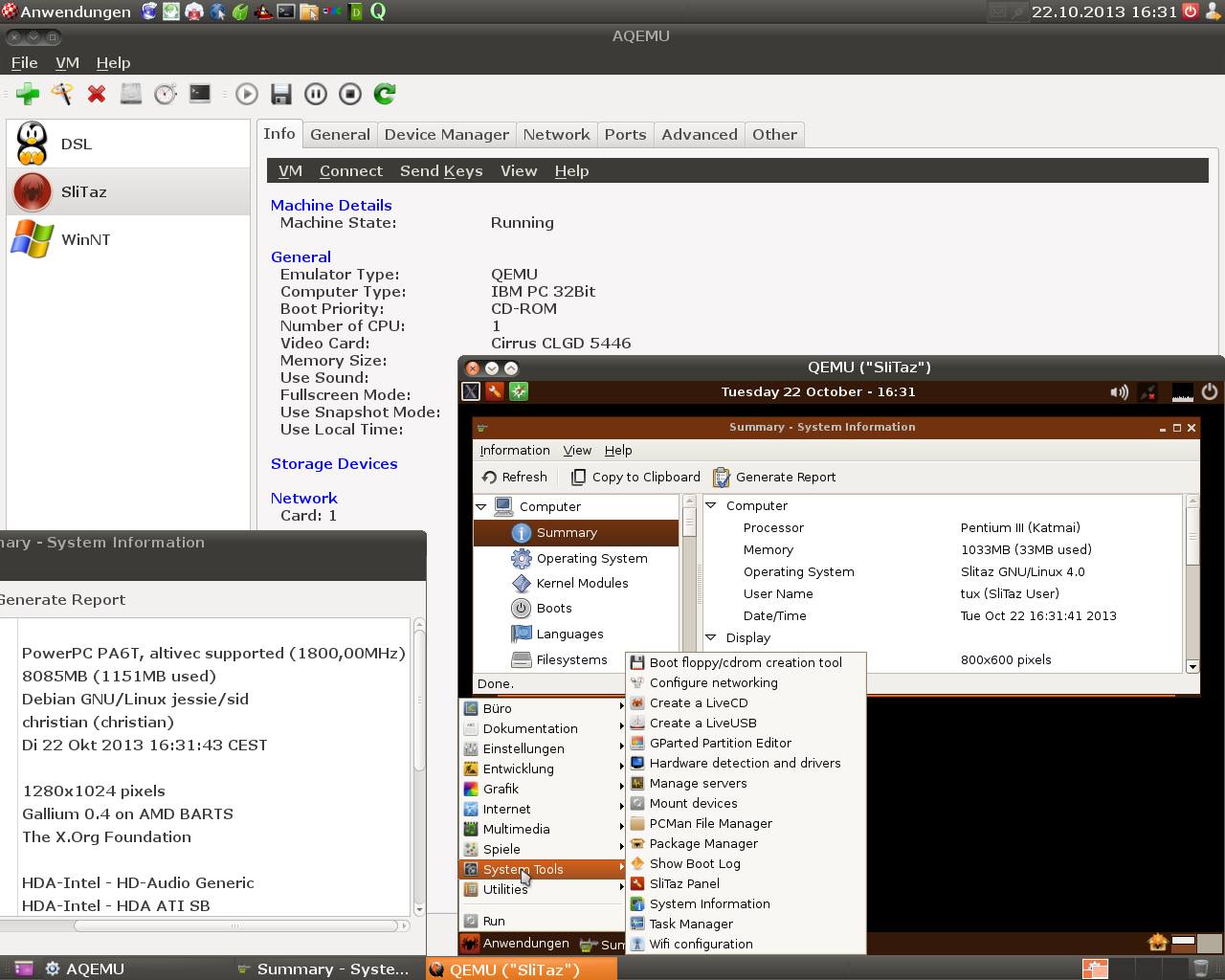 Screenshot of QEMU with SliTaz Linux (x86 Pentium 3) on the X1000: