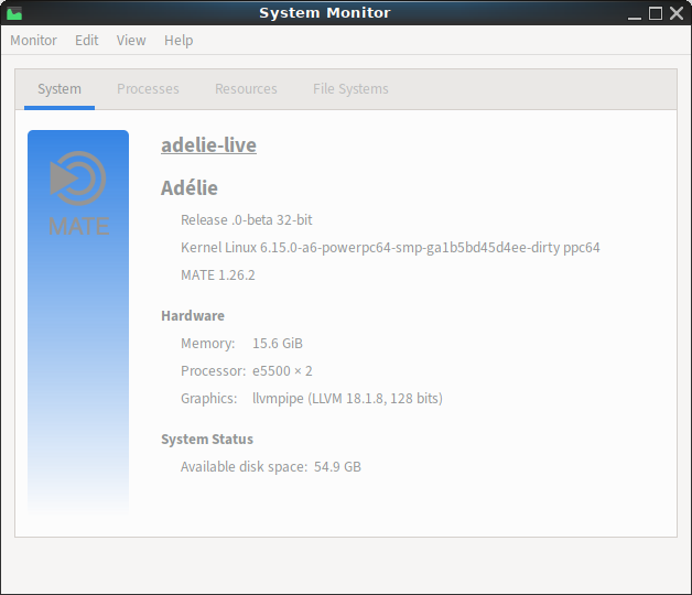 I downloaded the Kernel 6.15 Alpha6 archive to Adelie, but again Engrampa de-archives it as an empty 0-byte file named "/home/live/Downloads/linux-image-6.15.0-alpha6-X1000_e5500." So I took care of it from Fienix again. Back to Adelie, and its System Monitor says it's getting along fine with the new Kernel.