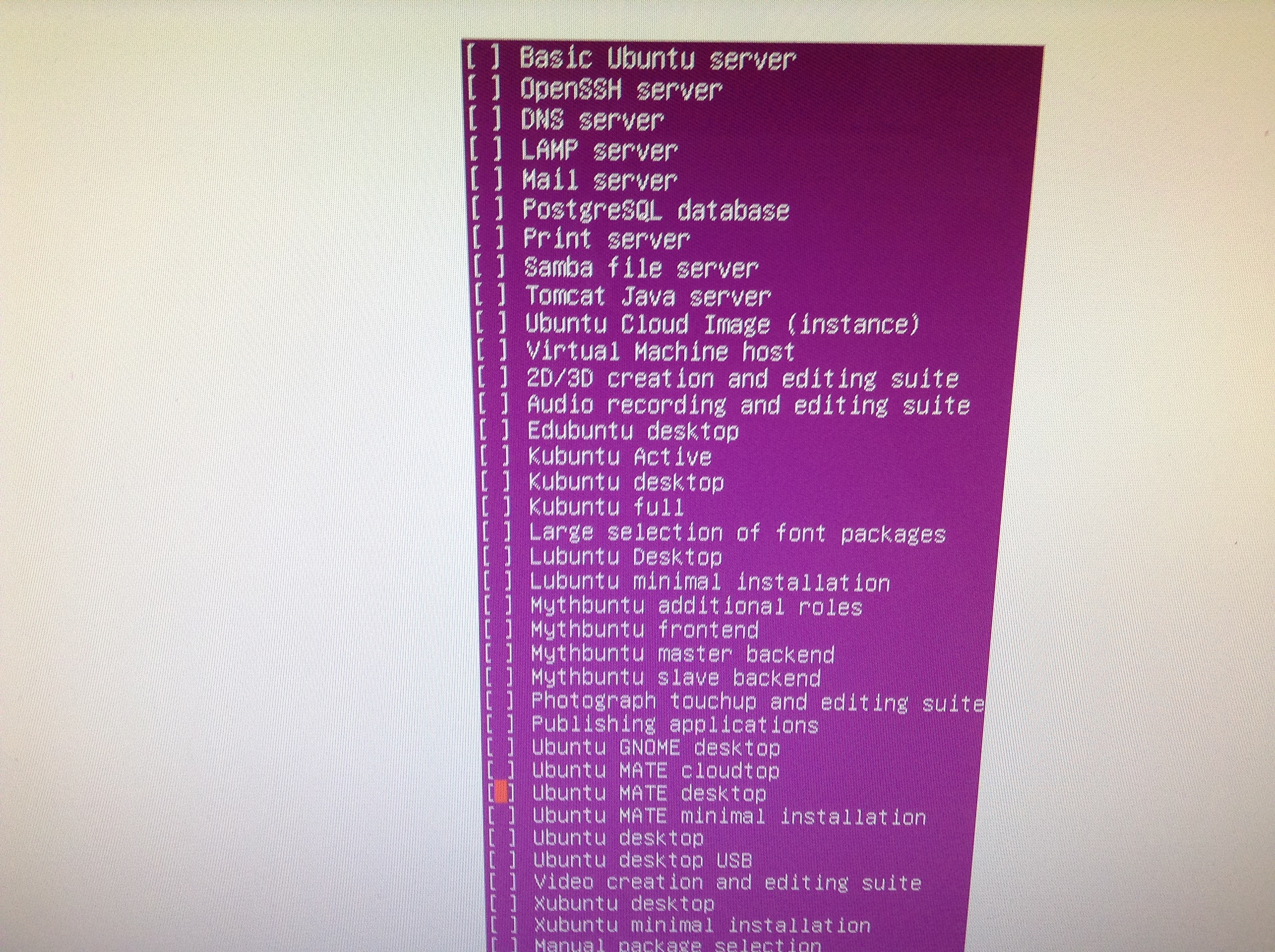 26. At the software selection screen you will be asked to select which *buntu flavour(s) you would like to install. You can install as many as you like. To install the Ubuntu Server arrow to the “Basic Ubuntu Server” option and press the space bar to mark the option. I recommend to install the OpenSSH Server, too. Now press return to continue.