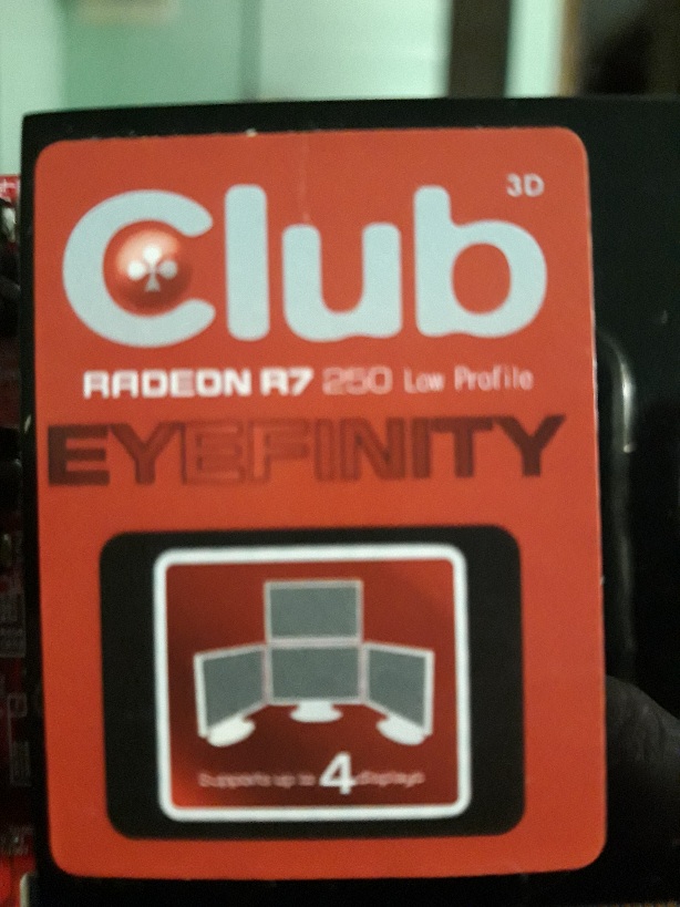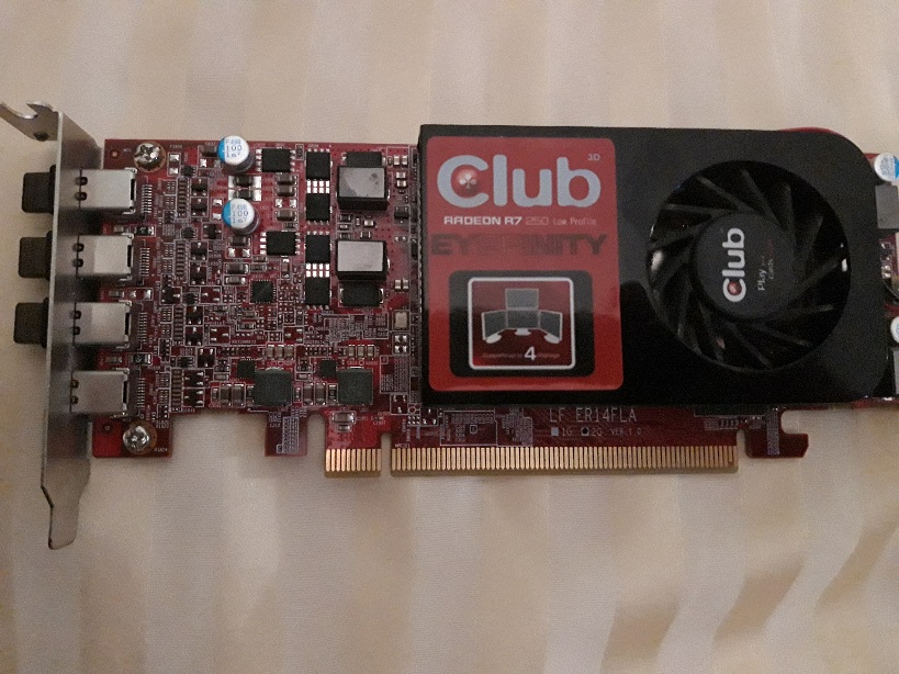 I then bought a Club3D Radeon R7 250 Eyefinity4 in Germany with four mini display port outputs which should heat up less.