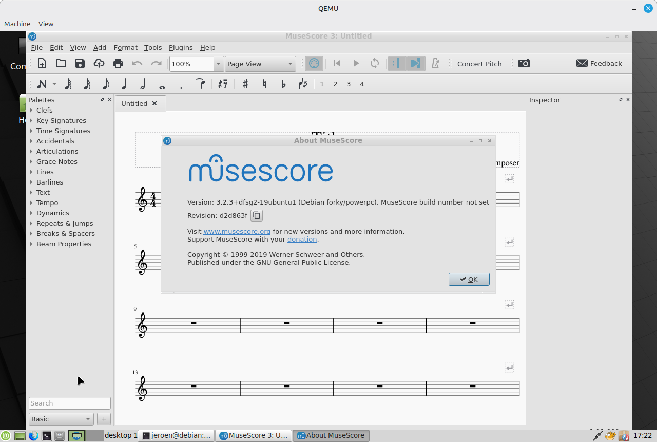 Ok... I checked that the version I have on the old MintPPC is 3.2.3+dfsg2-16 (Debian sid/powerpc). 2.x is still usable but it cannot load files created with 3.x.mintppc wrote:I tried to find a solution for musescore but didn't get it to work.