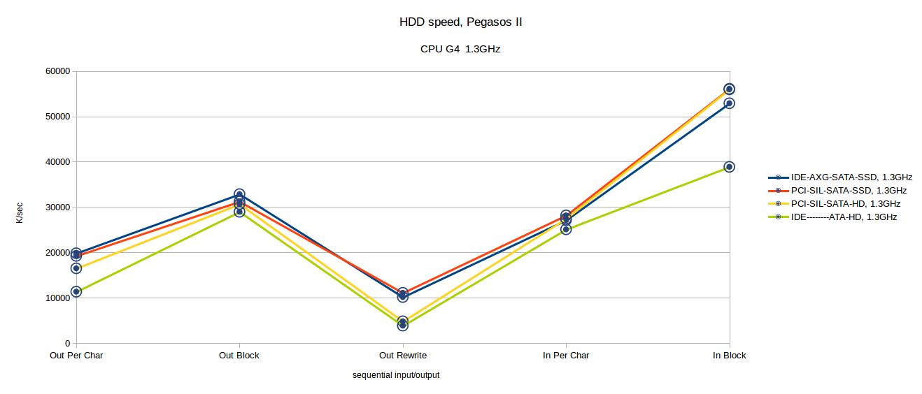 Also is visible that on Pegasos2 have pracrically no speed impact which SATA card we use: IDE-SATA converter and PCI-SATA card have both similar speed.