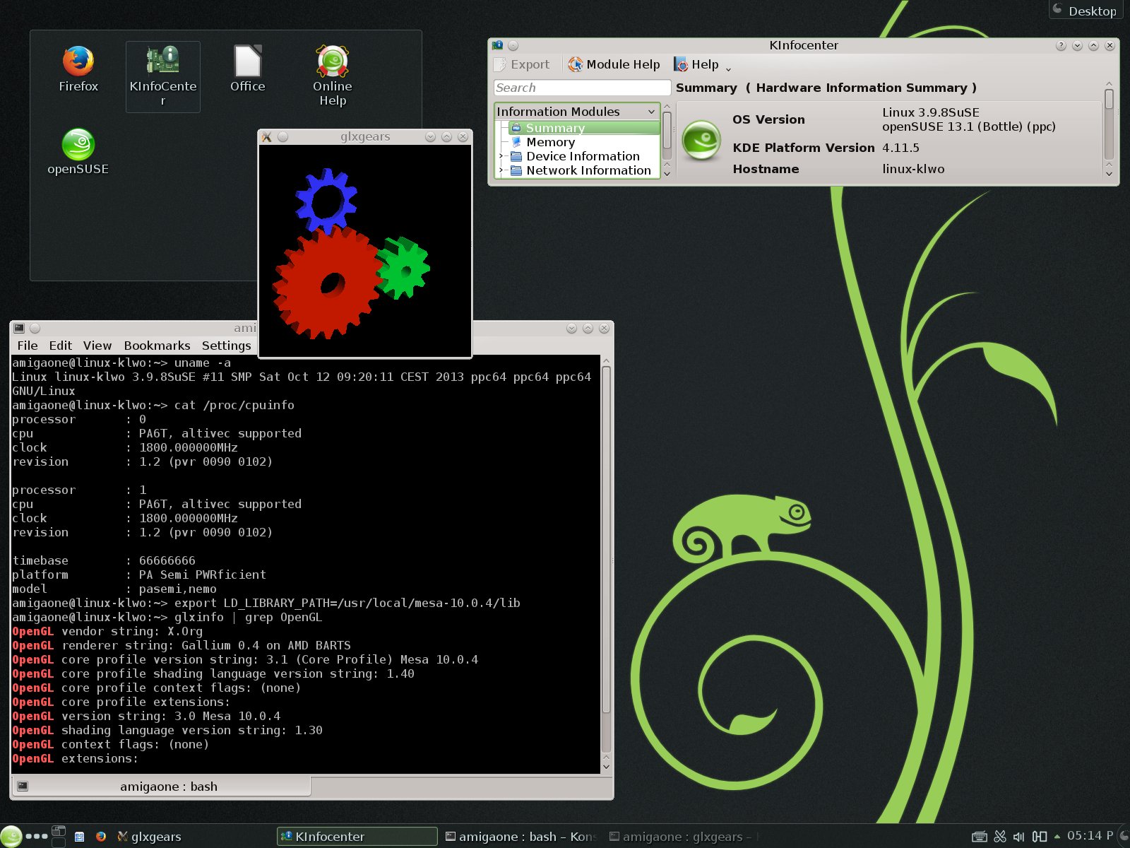 Do you mean Mesa? This openSUSE in the screenshot above, is the version 11.1-2. This version has an old Mesa system. This Mesa doesn't know our new Radeon HD cards. Therefore it doesn't have 3D acceleration. But ... the latest version 13.1-1 is available for our AmigaONE X1000 too.musa wrote:hi Xeno74