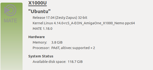 Hi Tom,tbreeden wrote:vmlinux-4.14-rc6 works well on my X1000, Ubuntu 17.04, MATE 1.18.0Download: vmlinux-4.14-rc6-AmigaOne_X1000_X5000.tar.gz