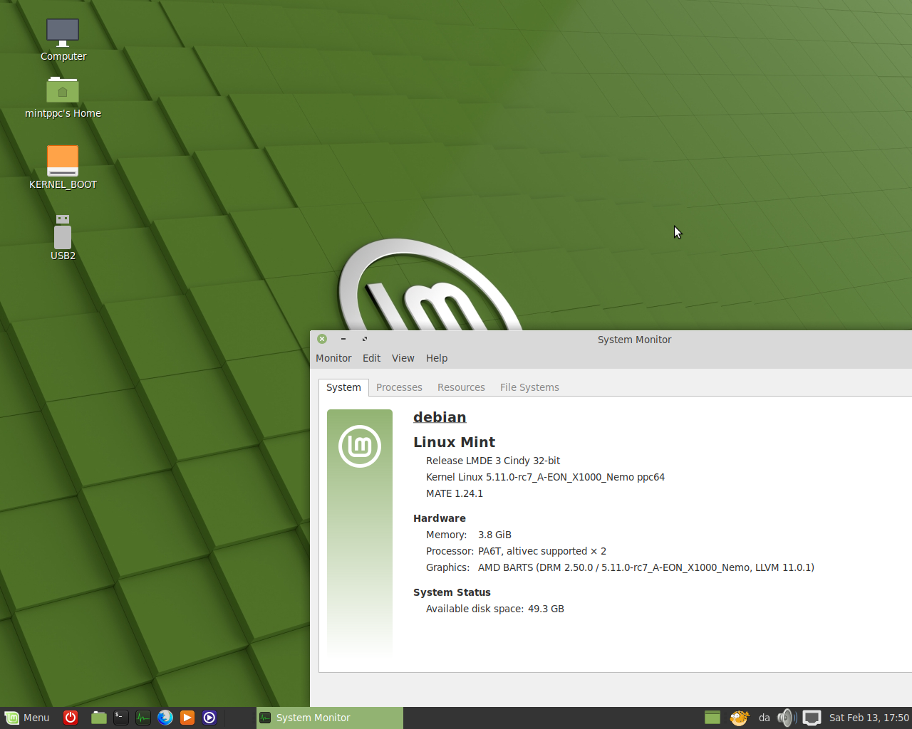 Mintppc32 from the MintPPC32-x5000 usb images . Make a new fstab and emthy the boot folder.Then DD to a emthy partion and bootet with