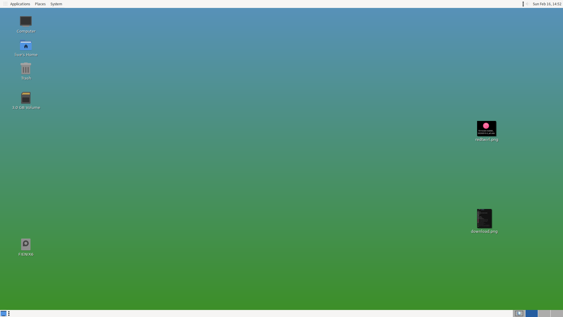 With my current Adelie I get a green screen which shows my Desktop items plus "Computer," "live's Home," "Trash," and three Removable Media. Along the left screen top margin: