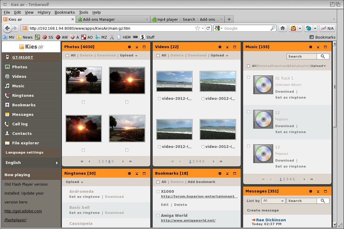 Yea same here. I only tried mui-owb but will try with timberwolf later. As you say some stuff needs java and flash. For example uploading/downloading one file is ok but if you want to download/upload several files then it needs java. I havent tried that much. It feels a bit slow, ofcourse it goes thru wifi. Another way is using FTP but i havent tried it yet. That would be easier for down/uploading files and probably faster. But using webbrowser and kies air is nice if you want to use a complete gui on the browser and see all in categories etc like on that picture. There is filemanagers with builtin ftp and other ways to control devices. So theres more possibilites. Its like a computer, just find the right tools.