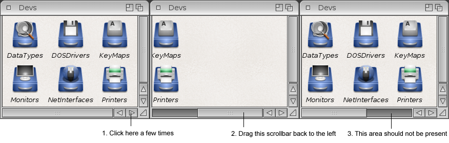 trixie wrote:I see this differently. The window arrows do not expand the window area - the size gadget does! The arrows (and the scroller) are there to let you scroll and view the window contents that does not fit in the window area. The scroller, then, shows how far beyond you are. If there is no contents beyond the window area, the scroller should not let you scroll. So what mrupp describes is a bug in my view.
