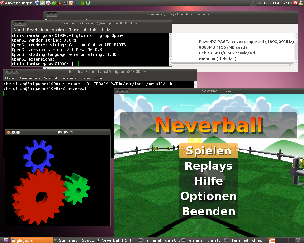 4. Test it with glxgears. When you see the correct colors then you use the new version of Mesa. After that you can start some games for example Neverball.