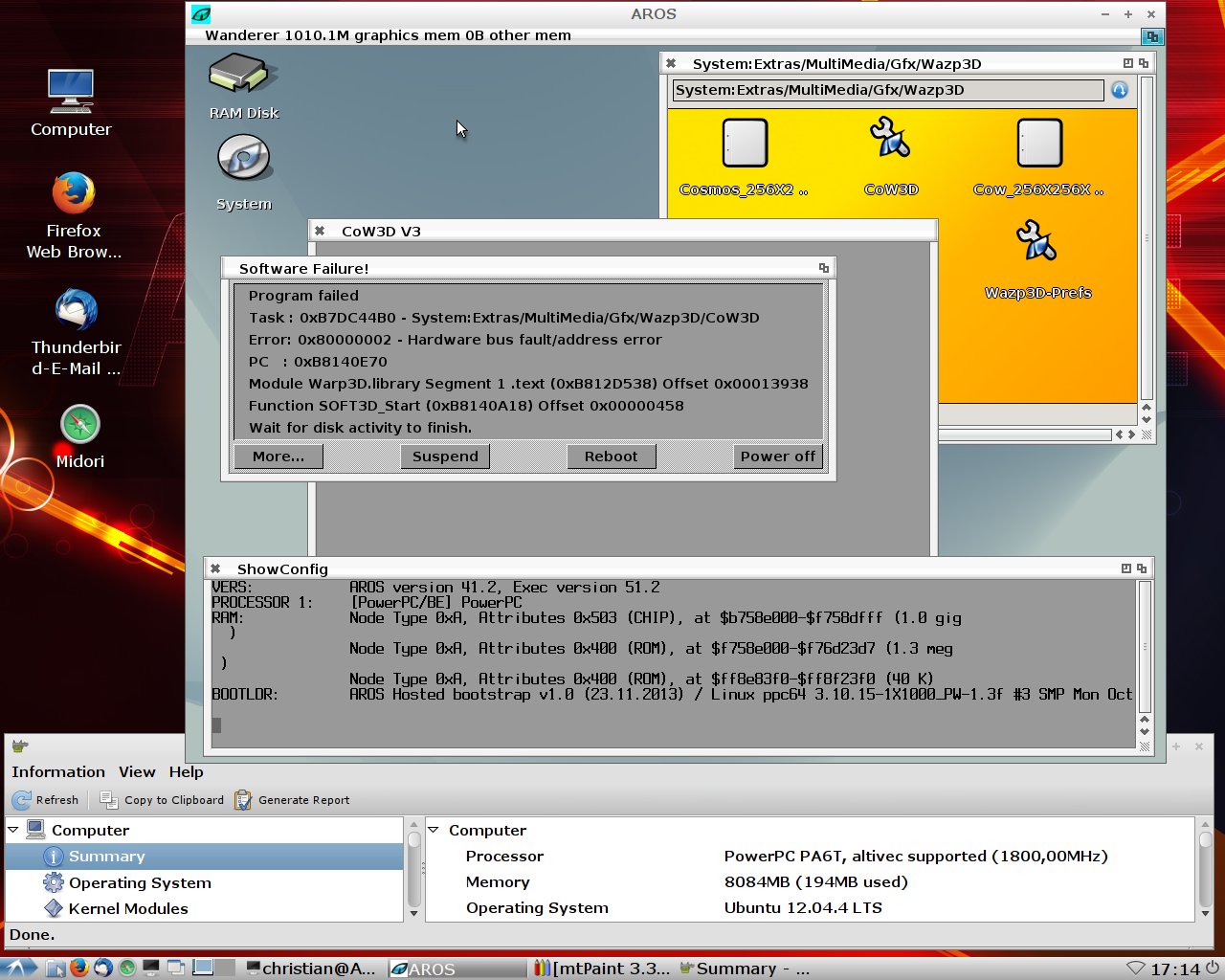 Note: This is not a nativ AROS installation. Therefore this not a AROS topic. This is a Linux topic. With AROS hosted you can run AROS PPC applications on Linux. AROS hosted is a Linux application.
