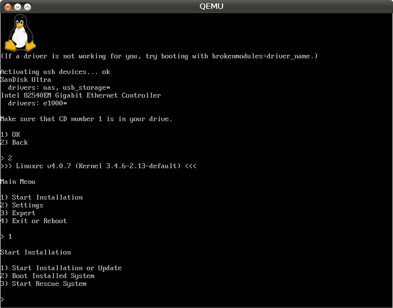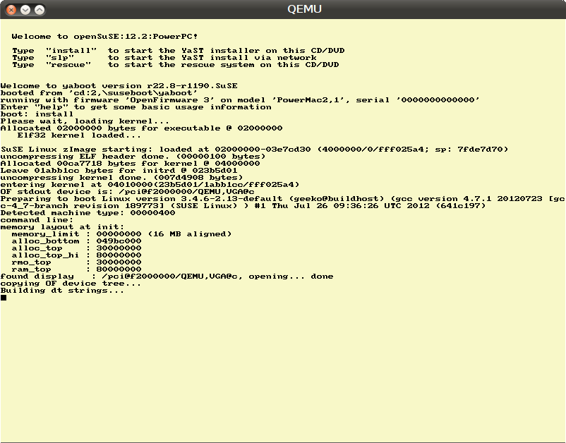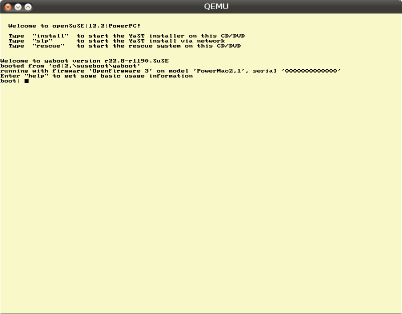 qemu-system-ppc -M mac99 -m 2048 -bios /usr/share/openbios/openbios-ppc -cdrom openSUSE-NET-ppc-Build0022-Media.iso -usb -usbdevice host:0781:556c -boot order=d -net nic,vlan=0,model=e1000 -net user,vlan=0
