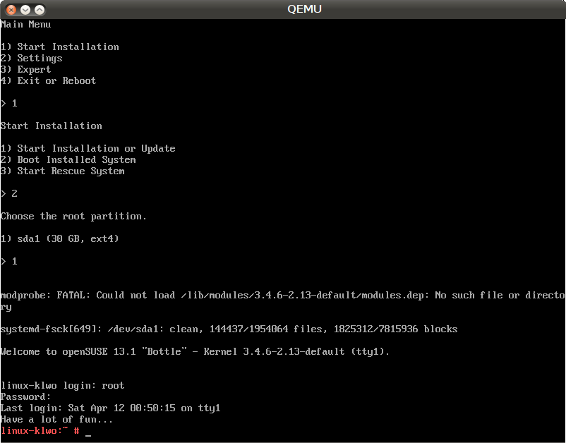 order to install openSUSE 13.1-1. Login to your current Linux distribution, e.g. Debian or
