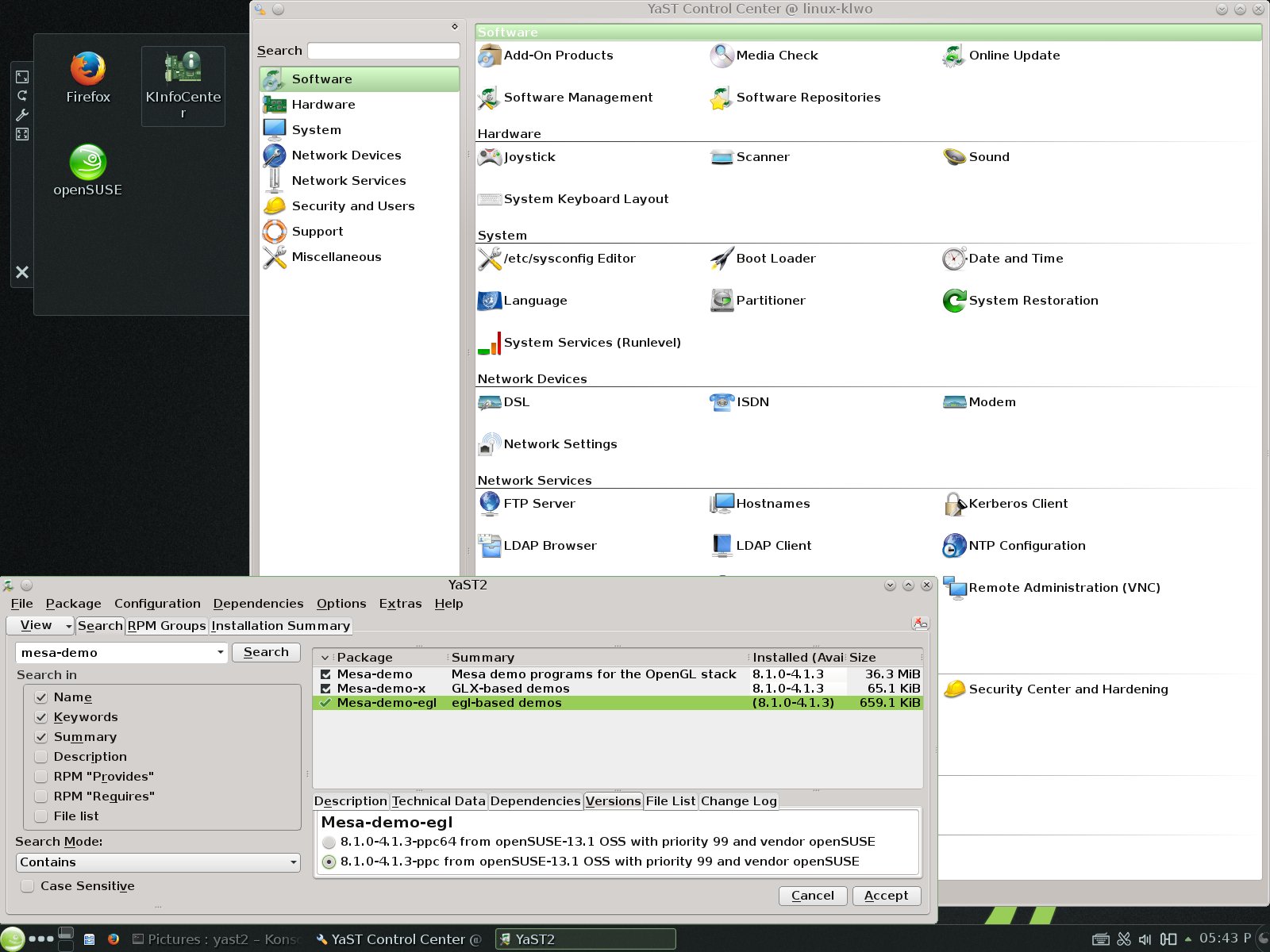Be aware, that openSUSE is experimental and isn't supported. openSUSE for the X1000 is alpha software! It's only for testing! Please install only 32-bit packages with YaST2 or zypper because 64-bit packages won't work. The PA6T is not compatible (enough) to POWER4 which is the minimum requirement for 64-bit openSUSE 13.1 to work.